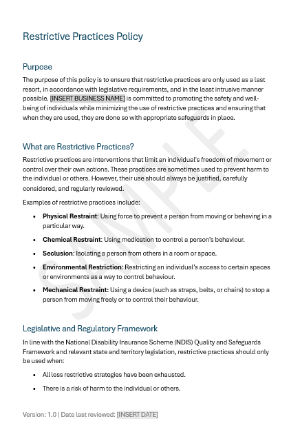 This complete policy and procedure pack helps meet the NDIS Practice Standards – Core Module, specifically tailored for Behaviour Support Practitioners. Includes professionally written, audit-aligned templates ready to customise for your business, as well as a User Guide to help you understand each document, know when and how to use it, and confidently prepare for your NDIS audit with step-by-step guidance.